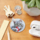 A keychain with a cute Christmas photograph of a grey tabby cat playfully biting a red santa hat.