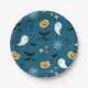 Cute paper plate featuring whimsical Halloween ghosts, pumpkins, spiderwebs and bats against a dark blue backdrop.