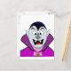 This funny cartoon vampire picture works for Halloween or a vampire-themed party. A cute cartoon vampire image, with pale skin and pointy ears, wearing a purple cape, is smiling a toothy grin.