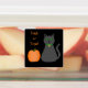 This awesome set of food Favour labels features a digital art image of a cute grey cat with black ears, nose and mouth and bright green eyes. The cat is wearing a green collar with a bright glowing orange gemstone charm set in gold. The cat is sitting next to an orange pumpkin. There is custom text so you can include a message. The default message reads Trick or Treat! making these ideal labels for party favours and trick or treat gifts.