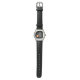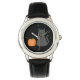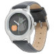 This awesome watch features a digital art image of a cute grey cat with black ears, nose and mouth and bright green eyes. The cat is wearing a green collar with a bright glowing orange gemstone charm set in gold. The cat is sitting next to an orange pumpkin.