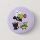 A button with a black flying bat, a green mummy bat wearing white bandages and a cute black cat with an orange witches hat. Boo written in fun colorful letters with a happy ghost floating behind.