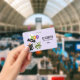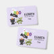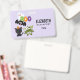Name badge with a black flying bat, a green mummy bat wearing white bandages and a cute black cat with an orange witches hat. Boo written in fun colourful letters with a happy ghost floating behind. Light purple background.