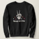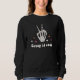 This funny Halloween design features the text Creep it Real in a trendy retro typography and a skeleton hand giving a peace sign and starbursts in pink orange and white.