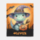 This adorable Halloween fleece blanket for kids features a cute little T-rex dinosaur wearing a witch hat.