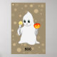Cute Halloween ghost holding a candle & pumpkin on beige Poster. Boo text can be personalized.