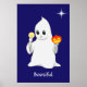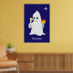 Cute Halloween ghost holding a candle & pumpkin on navy blue Poster. Bootiful text can be personalised.
