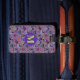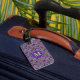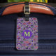 This cute Halloween luggage tag has a sweater pattern is based off of the theme of classic Fair Isle knitted designs. The pattern is of purple and green circles and diamond stripes. Each shape has a different cute Halloween motifs in it. You have black cat with a moon, Frankenstein’s head, happy jack o’ lantern pumpkin, skull with red eye raven, witches hat with feet, grave yard with ghosts, vampire lips/teeth with bats, and a picketed fence yard with a fall tree the moon with a bat. In-between the designs are candy corn, wrapped candy and a diamond design. On the front in matching colour is where you can put your initial. On the back you can personalise this with your information or delete the info for it to be blank.