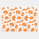 Cute mixed pattern Halloween papers for wrapping gifts and goodies in orange and black designs with all the characters - pumpkins, bats, spiders, skeletons, witches and black cats.