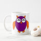 This stylish mug features a cute owl with its eyes shut as if it is sleeping and cute claws. Its body is purple and its wings, ears and claws and beak are orange. This cute owl is so adorable adults will love it just as much as kids.