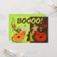 Personalise Cute Boo Halloween invitation with six happy pumpkins, two owls and three ghosts. One Half is light green and other half is dark brown.
