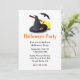 Cute custom Halloween party invitation, with simple graphics of a witch's hat, broom, and a bat, at the top of the white invitation. Personalise all the text for your Halloween bash. Suitable for adult and children parties.