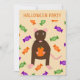This awesome Halloween party invitation features a graphic image of a cute little brown rat with pink ears tail and feet. The rat is holding an orange pumpkin between its paws. There is a collection of green, purple and orange candy sweets surrounding the little rat. This design is perfect for any rat lover or owner this Halloween.