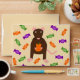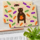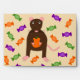 This envelope features a graphic image of a cute little brown rat with pink ears tail and feet. The rat is holding an orange pumpkin between its paws. There is a collection of green, purple and orange candy sweets surrounding the little rat. This design is perfect for any rat lover or owner this Halloween.