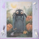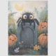 A cute, fluffy spider perched on a gravestone amidst pumpkins and autumn flowers.