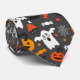 Cute assorted Halloween symbols seamless pattern with a dark-grey background. Ghosts spiders bats and pumpkins in orange white and yellow.