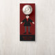 This awesome door hanger features a digital art image of a creepy but cute Halloween Vampire. The vampire has spiky black hair, a red shirt and black jacket with blood red heart shaped buttons on it. He has a creepy smile and long white fangs. He also has yellow fingernails, purple socks and black shoes with gold buckles on them. His arms are open welcoming you for an evil embrace. There is custom text on the front and back so you can turn it round to let everyone know if you are busy or available.