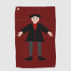 This awesome golf towel features a digital art image of a creepy but cute Halloween Vampire. The vampire has spiky black hair, a red shirt and black jacket with blood red heart shaped buttons on it. He has a creepy smile and long white fangs. He also has yellow fingernails, purple socks and black shoes with gold buckles on them. His arms are open welcoming you for an evil embrace.
