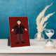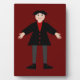 This awesome plaque features a digital art image of a creepy but cute Halloween Vampire. The vampire has spiky black hair, a red shirt and black jacket with blood red heart shaped buttons on it. He has a creepy smile and long white fangs. He also has yellow fingernails, purple socks and black shoes with gold buckles on them. His arms are open welcoming you for an evil embrace.