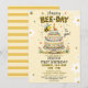 This charming 1st birthday design features a cute smiling bee on top of a birthday cake with a number 1 candle, yellow background with scattered white flowers, and bold yellow-and-black “bee-day” lettering.