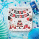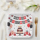 Cute happy birthday ladybug theme. Red, black and white design with balloons, paper hats, gift boxes and cake.