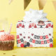 Cute happy birthday ladybug theme. Red, black and white design with balloons, paper hats, gift boxes and cake.