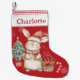 Add a touch of festive cheer to your home with our delightful Christmas stocking, featuring a cute bunny rabbit and a Christmas tree with festive details. The stocking features a white cuff and a red gingham border, perfect for personalising with a name. Great for children and the whole family, this stocking is a cherished keepsake that will bring joy to your holiday celebrations for years to come. Fill it with holiday surprises to make Christmas morning extra special. Coordinating items available in-store! (c) The Happy Cat Studio