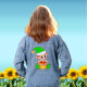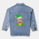 Modern happy and cute Christmas elf holding a gift box Jacket. Text can be personalised.