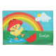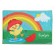 Celebrate the rain with this cute happy duck pillowcase. Pillowcase has a joyful yellow duck splashing in a puddle. The duck is wearing a polka dot hat and has a red umbrella. In the sky is a beautiful colourful rainbow, sun, clouds, and rain. Personalise the pillowcase with your child's first name.
