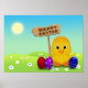 Cute Easter illustration featuring a little chick holding a wooden sign with Happy Easter greeting, sitting in a flower field next to colored Easter eggs.