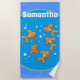 This adorable cartoon style design beach towel features 5 happy orange fantail goldfish surrounded by bubbles on a light blue background which can be changed.