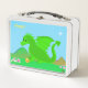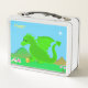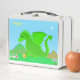 Cute happy green baby dragon playing with golden ball, flowers & star Lunch Box. Happy text can be personalised.