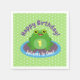This cute happy green frog is just waiting for a party! Drawn in fun cartoon style on a bright green polka dot background.