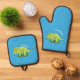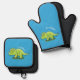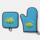 Cute happy green triceratops dinosaur cartoon oven mitt & pot holder set