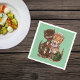 This paper napkin has two cute happy cats, one male, one female sharing rats from the yellow female's green basket on a deep mint green background.
