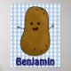 Adorable custom poster featuring a cute brown cartoon potato with a big happy smile, dots for eyes and stick arms. The background is a classic pattern of blue and white check, gingham. Below the potato in blue lettering is a template to add your name or other text to personalise.