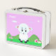 Cute happy sheep cartoon, flowers & star on violet background Lunch Box. Happy text can be personalised.