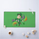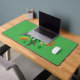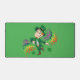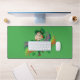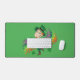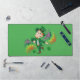 Desk Mat with an Illustration of a cute happy smiling and dancing leprechaun, he's wearing a green suit and a top hat and is surrounded by rainbow-coloured splashes