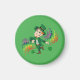 Magnet with an Illustration of a cute happy smiling and dancing leprechaun, he's wearing a green suit and a top hat and is surrounded by rainbow-coloured splashes
