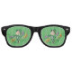 Sunglasses with an Illustration of a cute happy smiling and dancing leprechaun, he's wearing a green suit and a top hat and is surrounded by rainbow-coloured splashes