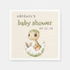 These cute baby shower napkins feature a beige and green watercolor baby dinosaur hatching from its egg, below the words "baby shower" in green hand printed font. Personalise the text with the name of the mum-to-be and the date in charcoal grey sans serif.