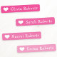 Cute clothing labels in shades of pink featuring a white or custom colour heart and your name or other custom text. You can change paw print and background colours with the customisation tool.