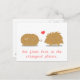 Cute illustration / cartoon of a hedgehog which comes across a brown scrub brush and falls in love with it because of its resemblance to itself. Funny caption reads "One find love in the strangest places. Amusing, whimsical and adorable design which will bring a smile to your loved ones. Wonderful for occasions like Valentines day or any romantic occasions.