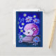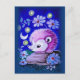 A cute hedgehog sitting on a rock, under night sky with stars and moon, and blue flowers.