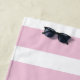 "Hello summer" beach towel in hand lettering and calligraphy style font with cute watermelon slices. The beach towel is pink and white stripes. Girly design. Digital illustration by Kristine Lee. For more, visit www.kristineleedesigns.com