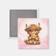 Add a little warmth and rustic charm to your space with this adorable highland cow square magnet. Featuring a fluffy baby highland cow cuddling a cosy teddy bear, this sweet illustration sits on a dreamy pink watercolor background filled with soft sparkles and magical glow.