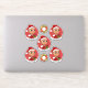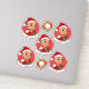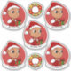 Set of seven cut-vinyl stickers with an illustration of a cute little happy smiling Hispanic or Asian baby boy or a girl, who is dressed in Christmas clothes and is wearing a red Santa Claus hat and holding a present, on a red background; five stickers of the baby and two stickers with a Christmas wreath; with a customisable text template for your name or message