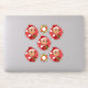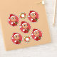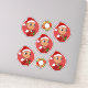 Set of seven cut-vinyl stickers with an illustration of a cute little happy smiling Hispanic or Asian baby boy or a girl, who is dressed in Christmas clothes and is wearing a red Santa Claus hat and holding a present, on a red background; five stickers of the baby and two stickers with a Christmas wreath