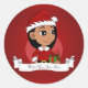 Round stickers with an illustration of a cute little happy smiling Latina/Hispanic or Asian girl with long black hair, who is dressed in Christmas clothes and is wearing a red Santa Claus hat and holding a present; Christmas holidays design on a red background, with an editable text template for your name or message