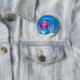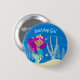 Cute custom mermaid birthday button that features an adorable purple haired Hispanic girl with a cool teal tail swimming next to beautiful seashells in the ocean. Cool summer button for a pool party or beach girl.